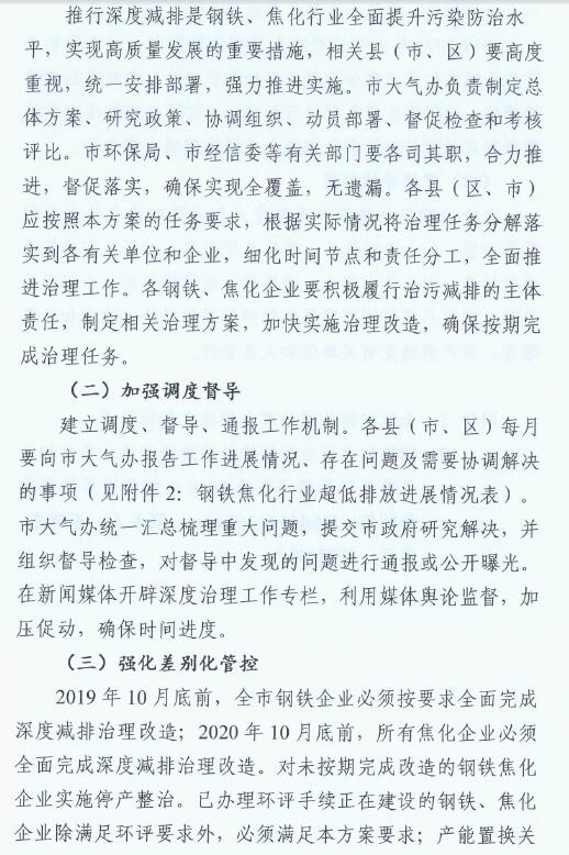 1、2019年6月底前,完成煉鐵、煉鋼等工序的超低排放改造;2019年10月底前,完成燒結機頭(球團焙燒)的超低排放改造。