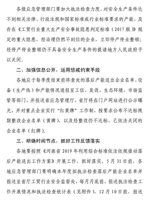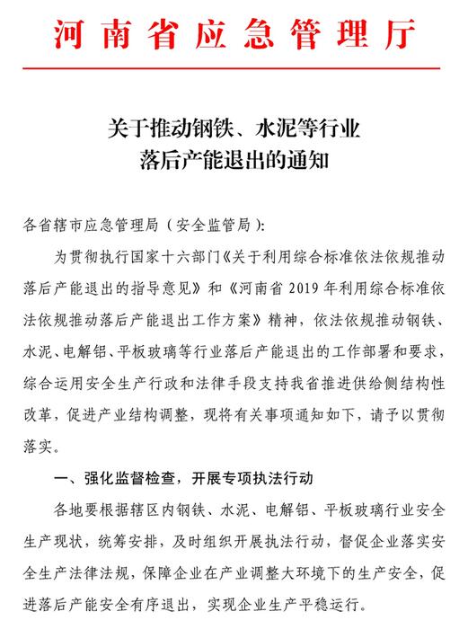 4月25日,河南省應(yīng)急管理廳下發(fā)《關(guān)于推動(dòng)鋼鐵、水泥等行業(yè)落后產(chǎn)能退出的通知》。《通知》明確表示將利用安全生產(chǎn)行政和法律手段推進(jìn)水泥、鋼鐵等行業(yè)落后產(chǎn)能退出。《通知》要求各級(jí)應(yīng)急管理部門(mén)要加大執(zhí)法檢查力度,對(duì)安全生產(chǎn)條件達(dá)不到相關(guān)法律、行政法規(guī)和國(guó)家標(biāo)準(zhǔn)或行業(yè)標(biāo)準(zhǔn)要求的產(chǎn)能,及存在《工貿(mào)行業(yè)重大生產(chǎn)安全事故隱患判定標(biāo)準(zhǔn)(2017版)》規(guī)定的重大隱患,經(jīng)治理仍然不到位的企業(yè),立即停業(yè)停產(chǎn)整頓;經(jīng)停業(yè)停產(chǎn)整頓仍不具備安全生產(chǎn)條件的提請(qǐng)地方人民政府予以關(guān)閉。