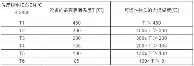 電氣設備按其最高表面溫度分為T1~T6組,使得對應的T1~T6組的電氣設備的最高表面溫度不能超過對應的溫度組別的允許值。溫度組別、設備表面溫度和可燃性氣體或蒸汽的引燃溫度之間的關系如下表所示: