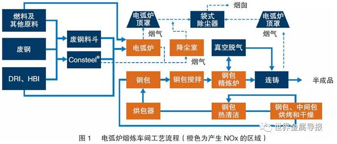 對(duì)于電弧爐熔煉車間,凡是帶有電弧或燒嘴的工藝或設(shè)備都應(yīng)被視為NOx的排放源,但正如本文后面將看到的,實(shí)際并不僅限于此。