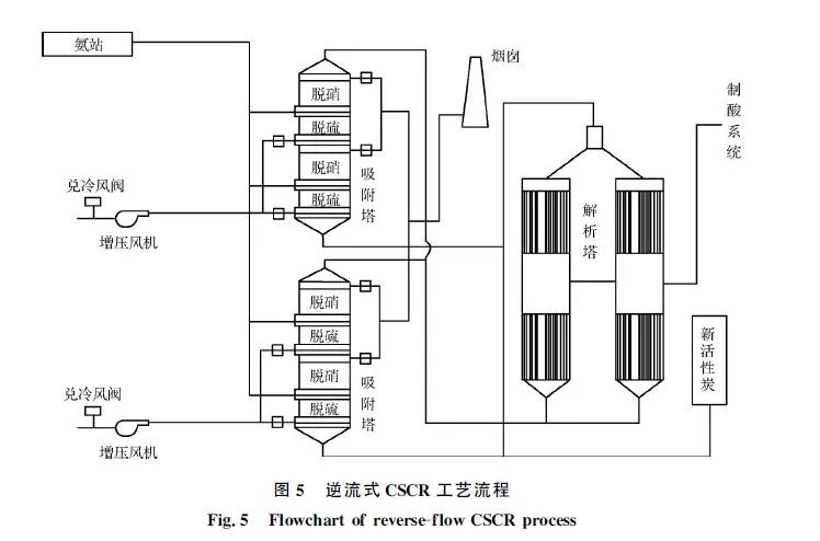 河鋼邯鋼在國內率先選用了逆流式活性炭選擇性催化還原(CSCR)凈化燒結煙氣工藝,工藝流程如圖5所示。SO2通過活性炭的吸附-解析,再經過催化氧化制成濃硫酸,實現(xiàn)了資源回收利用。通過脫硫段后,在上升的煙氣中進行噴氨,進入脫硝段后在活性炭的催化作用下NOx轉化為N2和水進行脫硝。2018年2月邯鋼西區(qū)燒結機投運了逆流式CSCR工藝,實現(xiàn)長周期穩(wěn)定運行和較高的煙氣凈化效率,2018年上半年原始煙氣顆粒物質量濃度為50~130mg/m3,SO2質量濃度為750~900mg/m3,NOx質量濃度為300~400mg/m3,凈化后煙囪NOx排放質量濃度低于50mg/m3,SO2排放質量濃度低于10mg/m3,固體顆粒物排放質量濃度低于15mg/m3。